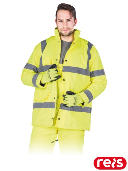Kurtka zimowa o intensywnej widzialności idealna dla drogowców.- powłoka 100% poliester Oxford powlekany poliuretanem- wyściółka 100% poliester o gramaturze 160 g/m2- podszewka 100% poliester typu tafta 190T- zapinana na suwak z dodatkowym zapięciem na napy, kaptur chowany w kołnierzu- po zewnętrznej stronie trzy kieszenie, w tym jedna na komórkę zapinana na rzep- od wewnątrz dodatkowa kieszeń zapinana na rzep- dół kurtki ściągany na gumkę- pikowana od wewnątrz, dzięki czemu zapobiega przesuwaniu się ociepliny- spełnia wymogi normy EN ISO 20471 (klasa 3)