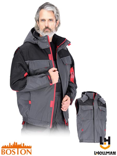 Kurtka zimowa BOSTON ocieplana polarem, wykonana z tkaniny typu rip-stop z odpinanymi rękawami.- powłoka poliester typu pongee powlekany PCV o gramaturze 340 g/m2- podszewka polar 190T o gramaturze 240 g/m2- wyściółka 100% poliester o gramaturze 120 g/m2- tkanina typu rip-stop - zabezpiecza przed rozdarciem w momencie zaczepienia o wystający przedmiot- dodatkowe wstawki wykonane z materiału poliester Oxford 720D znajdujące się na barkach oraz rękawach- zapinana na suwak z dodatkowym zapięciem na rzepy oraz napy- odpinany kaptur z troczkami z możliwością ściągnięcia z dodatkowymi napami- dodatkowa patka w tylnej części kaptura na rzep, umożliwiająca dopasowanie rozmiaru kaptura według upodobań użytkownika- duża ilość kieszeni: dwie w dolnej części, dwie duże w górnej części zapisane na rzep z dodatkowymi kieszonkami na suwak oraz przegródkami, dwie wewnętrzne kieszenie zapisane na rzep, w tym jedna na telefon komórkowy- duża liczba kieszeni zwiększa funkcjonalność kurtki- możliwość odpięcia rękawów, dzięki czemu uzyskamy ocieplany bezrękawnik- rękawy zakończone zapięciem na rzep- odblaskowe elementy przy patkach górnych kieszeni oraz na plecach- ściągacz u dołu kurtki zapewnia lepszą ochronę przed wiatrem- wytrzymała, dzięki czemu sprawdza się nawet przy najcięższych pracach