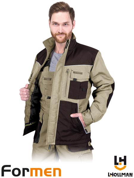 Kurtka ochronna ocieplana FORMEN, tkana.- powłoka 65% poliester, 35% bawełna o gramaturze 270 g/m2- wyściółka 100% poliester o gramaturze 220 g/m2- podszewka 100% poliester typu tafta 190T o gramaturze 50 g/m2- zapinana na suwak z dodatkowym zapięciem na rzepy- trzy kieszenie na klatce piersiowej, w tym jedna na rzep, jedna na suwak i jedna na telefon, dwie wąskie kieszonki na przybory np. długopis oraz dwie dolne- na ramionach, łokciach i w dolnych partiach kurtki wzmocnienie z czarnego materiału, co zwiększa wytrzymałość kurtki na przetarcia- przedłużany tył- staranne wykonanie oraz zwiększona wytrzymałość zapewniają wysoki komfort użytkowania- certyfikat OEKO-TEX® Standard 100 (testy na zawartość szkodliwych dla zdrowia substancji)