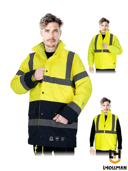 Kurtka ochronna ocieplana 4w1, męska.- kurtka zewnętrzna: tkanina 100% poliester Oxford 300D powlekany poliuretanem o gramaturze 190 g/m2- siateczkowa podszewka w górnej części tułowia 100% poliester o gramaturze 60 g/m2, zaś w dolnej części 100% poliester tafta 210T o gramaturze 55 g/m2- zapinana na zamek błyskawiczny z dodatkowym zapięciem na napy- kołnierz w formie stójki- kaptur ściągany na troczki z możliwością zwinięcia w kołnierz i zapięcia na rzep- dwie kieszenie w dolnej części zapinane na napy, jedna na klatce piersiowej na telefon komórkowy oraz kieszeń wewnętrzna zapinana na rzep- dół kurtki z możliwością ściągnięcia za pomocą troczków- kurtka wewnętrzna: tkanina 100% poliester Oxford 300D powlekany poliuretanem o gramaturze 190 g/m2- wyściółka 100% poliester o gramaturze 180 g/m- pikowana podszewka 80% poliester, 20% bawełna o gramaturze 180 g/m2- zapinana na zamek błyskawiczny- dwie kieszenie w dolnej części oraz kieszeń wewnętrzna zapinana na rzep- odpinane rękawy na suwak zakończone ściągaczem- tkanina we fluorescencyjnym kolorze i pasy odblaskowe zwiększające widoczność- idealna dla drogowców i innych służb porządkowych- fason: RELAXED