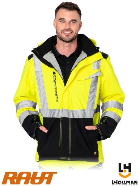 Kurtka ochronna ocieplana, męska.- tkanina z 2-kierunkowego stretchu o splocie rip-stop: 100% poliester powlekany membraną TPU o gramaturze 170 g/m2- wyściółka 100% poliester o gramaturze 120 g/m2 (tułów) oraz 100% poliester o gramaturze 100 g/m2 (rękawy)- pikowana podszewka 100% poliester tafeta o gramaturze 55 g/m2- 2-kierunkowy stretch - materiał, który rozciąga się w jednej płaszczyźnie- tkanina typu rip-stop - zabezpiecza przed rozdarciem w momencie zaczepienia o wystający przedmiot- zapinana na zamek błyskawiczny z dodatkowym zapięciem na rzepy- kołnierz w formie stójki- odsuwany kaptur ściągany na troczki z dodatkowym zapięciem na rzep dla lepszej ochrony głowy przed chłodem- dwie kieszenie w dolnej części zapinane na suwak, dwie na klatce piersiowej, w tym jedna zapinana na suwak, zaś druga na rzep oraz dodatkowa kieszeń na identyfikator- kieszeń wewnętrzna zapinana na rzep- rękawy zakończone zapięciem na rzep, umożliwiającym regulację ich szerokości- dół kurtki z możliwością ściągnięcia od wewnętrznej strony za pomocą troczków- tkanina we fluorescencyjnym kolorze i pasy odblaskowe zwiększające widoczność- fason: REGULAR