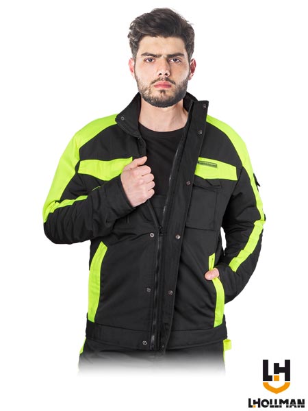 Kurtka ochronna ocieplana TANZO, tkana.- powłoka 65% poliester, 35% bawełna o gramaturze 270 g/m2- podszewka 100% poliester typu tafta o gramaturze 60 g/m2- wyściółka 100% poliester o gramaturze 150 g/m2- wstawki z kontrastowego materiału 65% poliester, 35% bawełna o gramaturze 195 g/m2- zapinana na suwak z dodatkowym zapięciem na napy- kołnierz w formie stójki- cztery kieszenie na klatce piersiowej, w tym trzy zapinane na rzep oraz jedna zapinana na suwak- dwie kieszenie po bokach w dolnej części zapinane na suwak- dodatkowa kieszeń na rękawie na rzep- rękawy zapinane na napy- u dołu kurtki regulacja szerokości zapięciami na napy- modne połączenie kolorów nadaje atrakcyjny wygląd