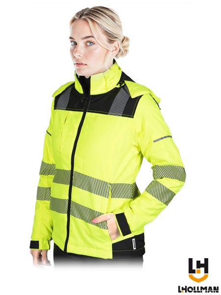 Kurtka ochronna ocieplana, damska.- tkanina: 100% poliester powlekany poliuretanem o gramaturze 170 g/m2- wyściółka 100% poliester o gramaturze 120 g/m2- pikowana podszewka 100% poliester tafta 210T o gramaturze 60 g/m2- zapinana na zamek błyskawiczny- kołnierz w formie stójki- odsuwany kaptur ściągany na troczki z dodatkowym zapięciem na rzep dla lepszej ochrony głowy przed chłodem- dwie kieszenie w dolnej części oraz jedna na klatce piersiowej zapinane na rzep- kieszeń wewnętrzna zapinana na rzep- rękawy zakończone ściągaczem z dodatkowym zapięciem na rzep- tkanina we fluorescencyjnym kolorze i pasy odblaskowe segmentowe zwiększają widoczność- idealne dla drogowców i innych służb porządkowych- fason: SLIM- testowane na zawartość szkodliwych dla zdrowia substancji zgodnie ze standardami OEKO-TEX® Standard 100- spełnia wymagania norm EN ISO 20471 (klasa 2), EN 14058 oraz EN ISO 13688