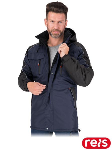 Kurtka ocieplana, męska.- tkanina: 100% poliester Oxford 300D powlekany poliuretanem o gramaturze 180 g/m2- wyściółka 100% poliester o gramaturze 160 g/m2- podszewka 3/4 długości polar o gramaturze 280 g/m2, dolna część pikowana podszewka 190T poliester tafta 55 g/m2- zapinana na zamek błyskawiczny z dodatkowym zapięciem na napy- kołnierzyk w formie stójki ocieplany polarem- kaptur ściągany na troczki z możliwością zwinięcia i zapięcia na rzep- dwie kieszenie w dolnej części oraz dwie podwójne na klatce piersiowej- na lewym rękawie kieszeń zapinana na rzep- dodatkowe dwie kieszenie wewnętrzne zapinane na rzep- rękawy zakończone ściągaczem z zapięciem na rzep, umożliwiającym regulację ich szerokości- dół kurtki z możliwością ściągnięcia za pomocą troczków- odblaskowe elementy zwiększające widoczność