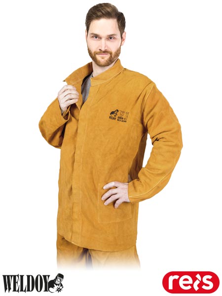 Kurtka ochronna spawalnicza, męska.- skóra bydlęca dwoinowa- szyta trudnopalnymi i odpornymi na gorąco nićmi z kevlaru- zapinana na rzep oraz napy, dodatkowo kryte plisą- kołnierz w formie stójki- kieszeń wewnętrzna z lewej strony zapinana na rzep- rękawy zakończone zapięciem na napy, umożliwiające regulację ich szerokości- zgodna z normą EN11611 (A1) oraz EN13688