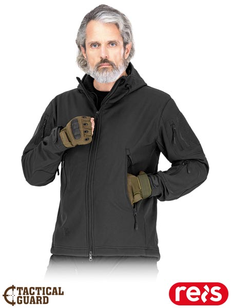 Kurtka ochronna Tactical Guard, męska.- trójwarstwowa tkanina softshell: 100% poliester, membrana TPU, polar 100% poliester- gramatura 310 g/m2- materiał SOFTSHELL - chroni przed deszczem oraz wiatrem, a jednocześnie pozwala skórze oddychać- zapinana na zamek błyskawiczny- kaptur z daszkiem ściągany na troczki z możliwością zwinięcia i przypięcia dodatkowym materiałem z rzepami na karku- dwie kieszenie w dolnej części zapinane na suwak oraz kieszeń wzdłuż dolnej partii pleców- trzy kieszenie na rękawach zapinane na suwak- rękawy zakończone zapięciem na rzep- dół kurtki z możliwością ściągnięcia za pomocą troczków- na ramionach rzepy przeznaczone na różnego typu emblematy i odznaczenia- dedykowana dla miłośników militariów, podróżników, fanów paintballu- idealna dla leśników i rybaków