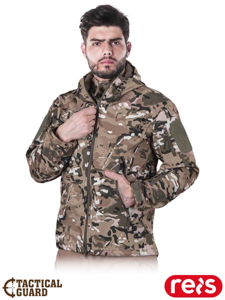 Kurtka ochronna Tactical Guard, męska.- trójwarstwowa tkanina softshell: 100% poliester, membrana TPU, polar 100% poliester- gramatura 310 g/m2- materiał SOFTSHELL - chroni przed deszczem oraz wiatrem, a jednocześnie pozwala skórze oddychać- zapinana na zamek błyskawiczny- kaptur z daszkiem ściągany na troczki z możliwością zwinięcia i przypięcia dodatkowym materiałem z rzepami na karku- dwie kieszenie w dolnej części zapinane na suwak oraz kieszeń wzdłuż dolnej partii pleców- trzy kieszenie na rękawach zapinane na suwak- rękawy zakończone zapięciem na rzep- dół kurtki z możliwością ściągnięcia za pomocą troczków- na ramionach rzepy przeznaczone na różnego typu emblematy i odznaczenia- dedykowana dla miłośników militariów, podróżników, fanów paintballu- idealna dla leśników i rybaków
