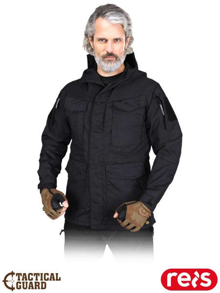 Kurtka ochronna Tactical Guard, męska.- tkanina rip-stop: 65% poliester, 35% bawełna- gramatura 210-220 g/m2- tkanina typu rip-stop - zabezpiecza przed rozdarciem w momencie zaczepienia o wystający przedmiot- zapinana na dwustronny suwak z dodatkowym zapięciem na rzepy- kaptur z daszkiem z możliwością zwinięcia i zapięcia na guzik- dwie podwójne kieszenie w dolnej części oraz dwie podójne na klatce piersiowej- kieszenie na obu rękawach zapinane na suwak- od wewnątrz gumka do ściągnięcia kurtki w pasie, dzięki czemu można ją dopasować do sylwetki i zabezpieczyć przed dostaniem się wiatru- otwór na słuchawki od wewnątrz- rękawy oraz dół kurtki zakończone zapięciem na rzep- po bokach kurtki dodatkowe suwaki dające możliwość wentylacji, które w pozycji otwartej utrzymywane są przez magnetyczne zamknięcia- dedykowana dla miłośników militariów, podróżników, fanów paintballu- idealna dla leśników i rybaków