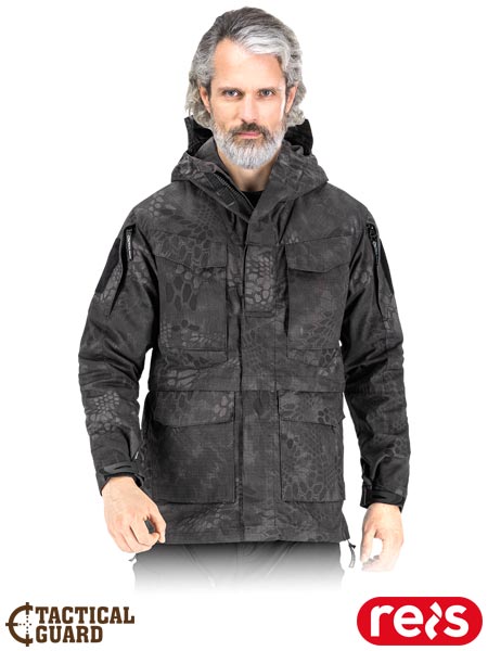 Kurtka ochronna Tactical Guard, męska.- tkanina rip-stop: 65% poliester, 35% bawełna- gramatura 210-220 g/m2- tkanina typu rip-stop - zabezpiecza przed rozdarciem w momencie zaczepienia o wystający przedmiot- zapinana na dwustronny suwak z dodatkowym zapięciem na rzepy- kaptur z daszkiem z możliwością zwinięcia i zapięcia na guzik- dwie podwójne kieszenie w dolnej części oraz dwie podójne na klatce piersiowej- kieszenie na obu rękawach zapinane na suwak- od wewnątrz gumka do ściągnięcia kurtki w pasie, dzięki czemu można ją dopasować do sylwetki i zabezpieczyć przed dostaniem się wiatru- otwór na słuchawki wewnątrz kurtki- rękawy oraz dół kurtki zakończone zapięciem na rzep- po bokach kurtki dodatkowe suwaki dające możliwość wentylacji, które w pozycji otwartej utrzymywane są przez magnetyczne zamknięcia- dedykowana dla miłośników militariów, podróżników, fanów paintballu- idealna dla leśników i rybaków