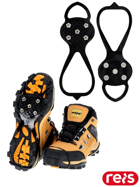Nakładki na buty.- wykonane z tworzywa TPR- bieżnik w przedniej części nakładki z 5 stalowymi kolcami- poprawiają stabilizację obuwia na ośnieżonym podłożu, oblodzonym płaskim terenie, minimalizując ryzyko poślizgnięcia się- przeznaczone do użytku w miejskim obszarze- lekkie i łatwe do zakładania- każda para pakowana w osobną torebkę