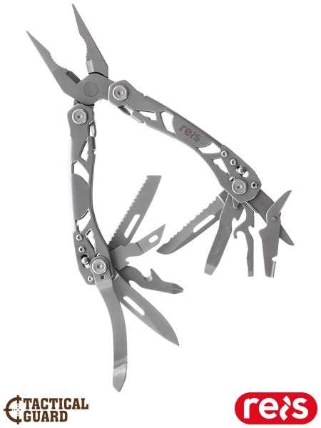 Narzędzie wielofunkcyjne.- wykonane ze stali nierdzewnej- 16 w 1: szczypce igłowe, zwykłe szczypce, przecinak do drutu, ząbkowane ostrze, śrubokręt płaski (5mm), pilnik/linijka, otwieracz do puszek, otwieracz do butelek, nożyczki, mały śrubokręt płaski, rozwiertak z szydłem, nóż, śrubokręt krzyżakowy, ściągacz do izolacji, piła do drewna, klips kieszonkowy- wyposażone w blokadę typu liner lock, co zwiększa bezpieczeństwo pracy- wykorzystywane podczas napraw w domu, jak i w ogrodzie- sprawdzi się podczas wypraw survivalowych, biwakowania, wycieczek, wędkowania