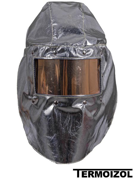 Osłona głowy i twarzy.- wykonana z tkaniny szklanej metalizowanej i tkaniny bawełnianej trudnopalnej stanowiącej podszewkę- osłona zakładana jest na hełm ochronny- osłona twarzy jest na stałe połączona z osłoną głowy i karku i nie ma możliwości regulacji ułożenia jej przedniej części- do osłony głowy i twarzy zamocowana jest aluminiowa ramka, w której umieszczany jest filtr ochronny. Użytkownik - wg potrzeby - może stosować różne wizjery, np.: poliwęglanowe, szklane, kompozytowe- chroni przed płomieniem, odpryskami płynnego metalu oraz intensywnym promieniowaniem cieplnym- przeznaczona jest do stosowania łącznie z ubraniem lub inną odzieżą ochronną do pracy przy spuście i rozlewaniu stali oraz metali kolorowych- należy użytkować wyłącznie z hełmem ochronnym firmy 3M model G3000- polecana m.in. dla: odlewnika metali, hartownika, walcownika, wytapiacza- zgodna z normą EN ISO 11612 (A1 B1 C3 D3 E3 F1)