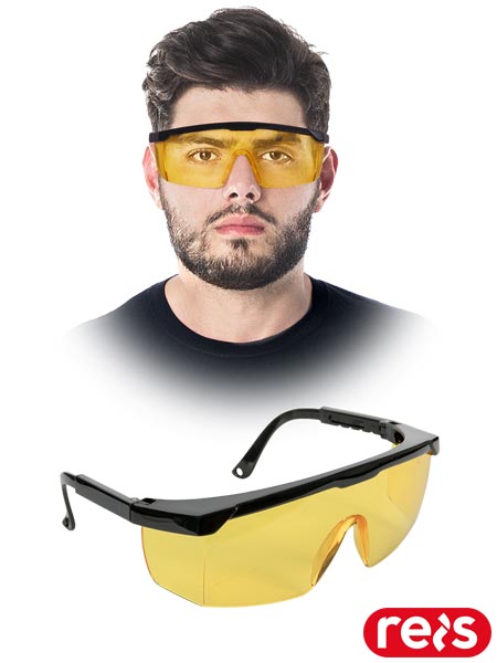 Przeciwodpryskowe okulary ochronne.- klasa optyczna 1- filtr chroniący przed nadfioletem 2C-1.2- szybki wykonane z poliwęglanu- czarna ramka wykonana z nylonu- okulary o żółtym zabarwieniu, poprawiają kontrast- posiadają regulację w długości ramion- na końcu ramion małe otwory, do których można doczepić np. sznurek, dzięki czemu można zawiesić okulary na szyi- okulary przeciwodpryskowe są przeznaczone do ochrony oczu przed odpryskami ciał stałych występujących podczas ręcznej i maszynowej obróbki metali, drewna, tworzyw sztucznych, materiałów ceramicznych, pozyskiwania kopalin itp.- zapewniają ochronę przed małymi odpryskami ciał stałych o energii uderzeń do 45 m/s (F)- spełniają wymagania normy EN166 oraz EN170
