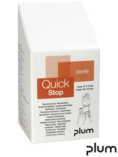 Zestaw opatrunkowy na rany QuickStop.- znajduje zastosowanie w przypadku mniejszych i większych krwawień- sterylny opatrunek ze zintegrowanym uciskiem- może być stosowany indywidualnie oraz jako uzupełnianie stacji QuickSafe Complete oraz Pull1Aid- w opakowaniu znajduje się opatrunek o wymiarach 17 x 17 cm (1 sztuka) oraz 12 x 7,5 cm (2 sztuki)