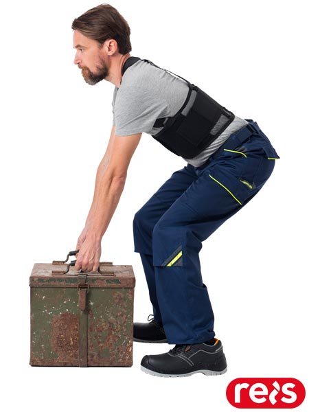 Pas ochronny antyurazowy.- dzianina: 100% poliester- wzmocnienie z poliestrowej tkaniny siateczkowej- podpory z polipropylenu- klamry z polioksymetylenu (POM)- zapinany na rzep- elastyczne szelki o regulowanej długości- wygodne dopasowanie w każdych warunkach