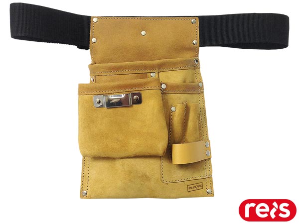 Pas monterski skórzany.- wykonana z najwyższej jakości dwoiny bydlęcej o grubości 1,5 mm – 1,7 mm- pięć kieszeni na narzędzia: jedna duża, jedna średnia oraz trzy małe- po środku znajduje się uchwyt na miarkę- z jednej strony umieszczono skórzany uchwyt na młotek- kieszenie umieszczone na taśmie szerokości 5 cm, z zapięciem w postaci metalowej klamry z możliwością regulacji pasa- konstrukcja pasa wzmocniona nitami