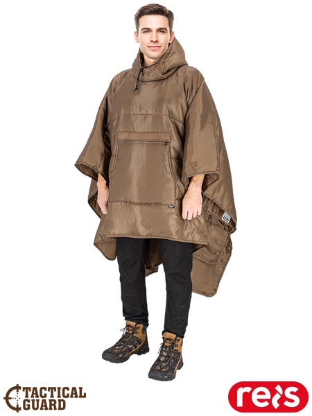 Ponczo turystyczne ocieplane Tactical Guard.- tkanina: 100% poliester tafta 190T o gramaturze 50 g/m2- wypełnienie: 100% poliester o gramaturze 100 g/m2- wymiary: 200x150 cm- zapinane na napy- kaptur ściągany na troczki- podwójna kieszeń- pełni funkcje kurtki, śpiworu, koca, a także podpinki pod hamak- pakowane w worek w kolorze poncza- dedykowane dla miłośników militariów, podróżników, fanów paintballu, leśników oraz rybaków- sprawdzi się podczas wycieczek jak i podczas survivalu