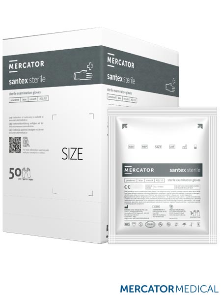 Sterylne rękawice lateksowe - pudrowane, santex® sterile.- pasują na prawą i lewą rękę- idealnie nadają się do skomplikowanych manipulacji- powierzchnia zewnętrzna gładka- mają zastosowanie w środowisku sterylnym środowisku medycznym oraz stomatologicznym- stanowią wyrób medyczny klasy I sterylnej, jak i środek ochrony indywidualnej kategorii III- pakowane po 50 par w opakowaniu- każda para pakowana w osobną saszetkę