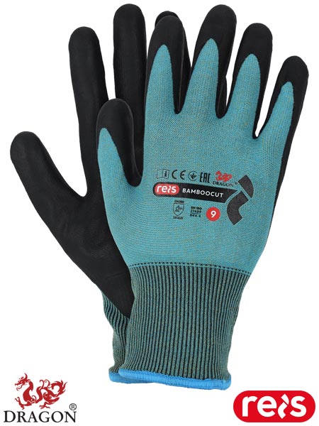 Rękawice ochronne.- dzianina: 40% włókno bambusowe, 23% włókno stalowe, 22% poliester pochodzący z recyklingu, 13% poliestru, 2% elastan ( ścieg 18)- powlekane nitrylem typu FOAM- zakończone ściągaczem- odporne na ścieranie i rozdarcie- zapewniają manualność oraz doskonałe czucie trzymanego przedmiotu- wysoki współczynnik odporności na przecięcie (D)- nitryl zwiększa odporność na smary, oleje, tłuszcze i węglowodory- wykorzystywane w budownictwie oraz przemyśle transportowym
