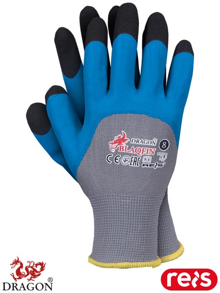 Rękawice ochronne powlekane.- dzianina: 100% poliester (ścieg 13)- w części chwytnej i do połowy w części wierzchniej powlekane niebieskim lateksem typu FOAM- dodatkowe powleczenie czarnym lateksem typu FOAM na końcówkach palców- zakończone ściągaczem- wytrzymałość i wysoka jakość gwarantują zadowolenie użytkowników- wykorzystywane w budownictwie oraz przemyśle transportowym