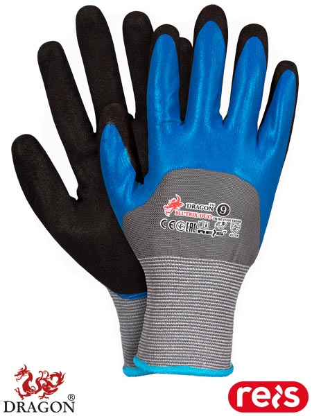 Rękawice ochronne.- dzianina: 100% poliester (ścieg 15)- w części wierzchniej powlekane gumą nitrylowo-butadienową NBR (ang. Nitrile Butadiene Rubber) typu smooth- w części chwytnej oraz na końcówkach palców powlekane gumą nitrylowo-butadienową NBR typu SANDY FINISH, która zapewnia doskonałą chwytność- zakończone ściągaczem- najwyższy współczynnik odporności na ścieranie (4)- elastyczne, dzięki czemu świetnie dopasowują się do dłoni- doskonałe dla mechaników, wykorzystywane podczas przeładunku i transportu- zgodne z normami EN388 (poziomy odproności: 4 1 3 1 X) oraz EN ISO 21420
