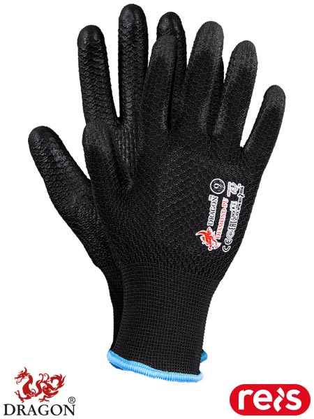 Rękawice ochronne.- 100% poliester (ścieg 13)- powlekane poliuretanem- zakończone ściągaczem- diamentowa struktura materiału oraz powleczenia- zapewniają manualność oraz doskonałe czucie trzymanego przedmiotu- wykazują bardzo dużą elastyczność oraz świetnie dopasowują się do dłoni- idealne do prac, gdzie wymagana jest precyzja