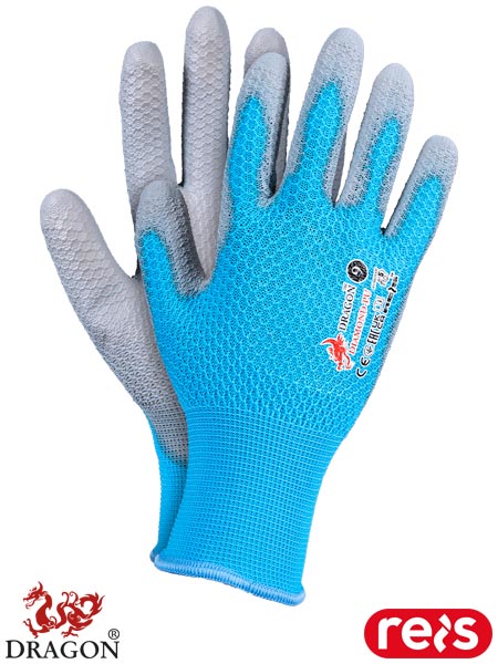Rękawice ochronne.- 100% poliester (ścieg 13)- powlekane poliuretanem- zakończone ściągaczem- diamentowa struktura materiału oraz powleczenia- zapewniają manualność oraz doskonałe czucie trzymanego przedmiotu- wykazują bardzo dużą elastyczność oraz świetnie dopasowują się do dłoni- idealne do prac, gdzie wymagana jest precyzja