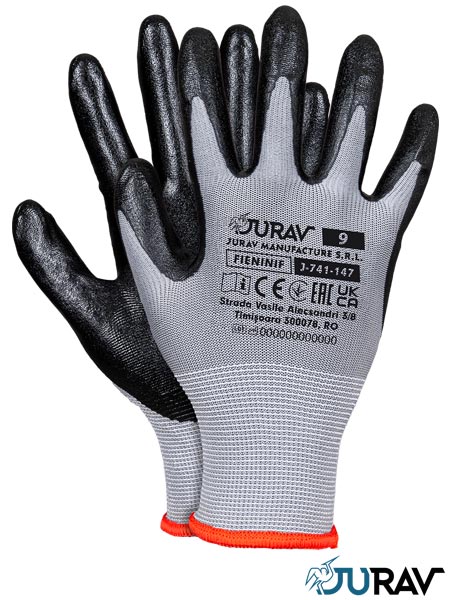 Rękawice ochronne.- dzianina: 100% poliester (ścieg 13)- powlekane nitrylem typu FOAM w kolorze czarnym- zakończone ściągaczem- wykazują bardzo dużą elastyczność oraz świetnie dopasowują się do dłoni- zapewniają manualność oraz doskonałe czucie trzymanego przedmiotu- nitryl zwiększa odporność na smary i oleje- wykorzystywane do ogólnych prac mechanicznych