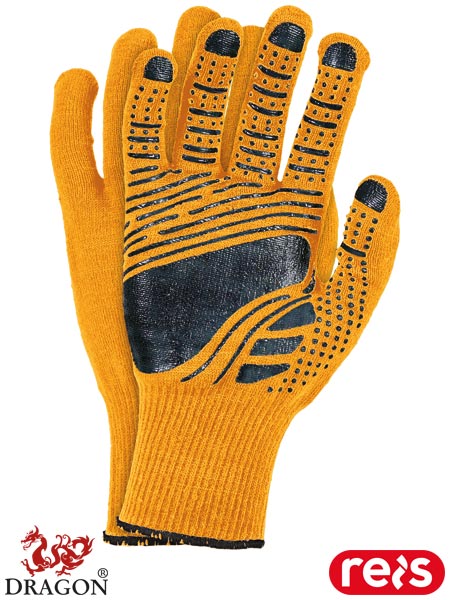 Rękawice ochronne.- dzianina: 100% poliester w intensywnym kolorze (ścieg 13)- powleczenie z PCV w kształcie linii papilarnych oraz drobnych kropek- zakończone ściągaczem- ergonomiczne - idealne dopasowanie do dłoni- charakteryzują się zwiększoną odpornością na przetarcie- zapewniają doskonałą manualność przy ograniczeniu ślizgania się trzymanego przedmiotu