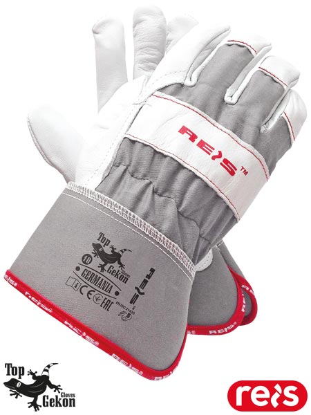 Rękawice ochronne wykonane ze skóry koziej.- skóra kozia licowa w jasnych kolorach- drelich i usztywniony mankiet w kolorze szarym- całodłonicowe - część chwytna rękawicy wykonana z jednego kawałka skóry, dzięki czemu wykazują większą wytrzymałość i odporność na przetarcia- od wewnątrz wypodszewkowane, co podnosi komfort użytkowania- szeroki zakres rozmiarów pozwalający na użytkowanie rękawic zarówno przez mężczyzn jak i kobiety- popularnie stosowane do ogólnych prac mechanicznych- wykorzystywane w budownictwie, przemyśle ciężkim