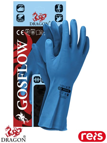 Rękawice ochronne.- wykonane z lateksu- flokowane - wewnętrzna powierzchnia rękawic pokryta jest flokiem (pyłem bawełnianym), co ułatwia wkładanie i zdejmowanie oraz zapobiega poceniu się rąk w czasie użytkowania- na części chwytnej chropowata struktura, dzięki czemu rękawiczki zyskują lepszą przyczepność- długość 30 cm- średnia grubość 0,40 mm- odporne na rozciąganie- wysoka odporność na detergenty i środki piorące- mogą być stosowane w kontakcie z żywnością- zapewniają ochronę przed bakteriami i grzybami- każda para pakowana w osobną torebkę, dzięki czemu świetnie się prezentują i są idealne na wszelkiego rodzaju prezentacje- potocznie znane jako floki lub rękawice gospodarcze