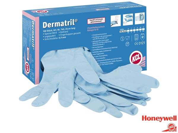 Jednorazowe rękawice nitrylowe DERMATRILL 740.- ochronne przeznaczone do użycia w: laboratoriach, instytutach badawczych, przemyśle chemicznym, spożywczym, elektronicznym i komputerowym, czyszczeniu i konserwacji oraz ochronie produktu- doskonałe wyczucie dotykowe- doskonały komfort noszenia- podwyższona wytrzymałość na rozrywanie- pewny chwyt dzięki porowatym końcówkom palców- dobra odporność chemiczna- dobrze dopasowany kształt- AQL < 0,65- nie zawierają lateksu naturalnego- odporne na wiele cytostatyków- odporne na wirusy według ASTM F 1671:2007- powierzchnia rękawic bez zawartości sylikonu (indyferencja wobec lakierów, bez zjawiska kraterowania)- dopuszczone do kontaktu z żywnością- rękawica jest wyrobem medycznym, w rozumieniu dyrektywy 93/42/EWG- opakowanie - 100 szt.- zgodne z normami EN420, EN374-5 oraz EN374-1 (K P T, TYP B)