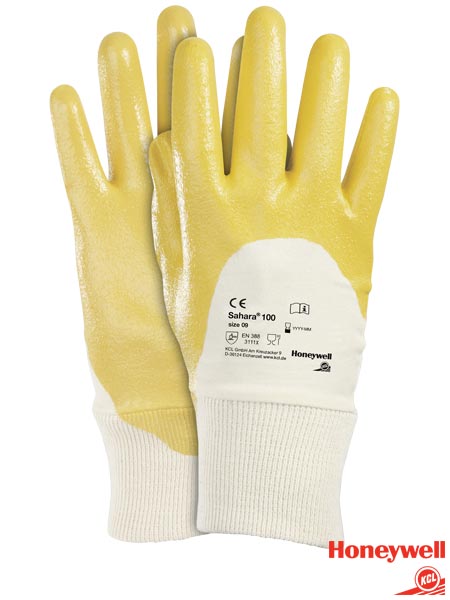 Rękawice ochronne SAHARA 100.- wysoka odporność na zużycie mechaniczne- posiadają właściwości antyelektrostatyczne ESD- wykonane z bawełny pokryte żółtym nitrylem w wewnętrznej części dłoni- znajdują zastosowanie w pracach z mokrymi i zaolejonymi częściami, w pracach ogrodniczych i obróbce drewna, pracach ślusarskich i budowach maszyn, rzemiośle budowlanym, pracach montażowych i transporcie, obsłudze wózków widłowych, przemyśle samochodowym- bezszwowy, neutralny dla skóry trykot oraz dziany ściągacz zapewniają wysoki komfort pracy, aktywna wymiana powietrza dzięki aktywnej bawełnie- dobre zabezpieczenie nadgarstka- dzianina w właściwościach hydrofobowych co utrudnia nasiąkanie wodą- dopuszczone do kontaktu żywnością- zgodne z normami EN388 (poziomy odporności: 3 1 1 1 X) oraz EN420