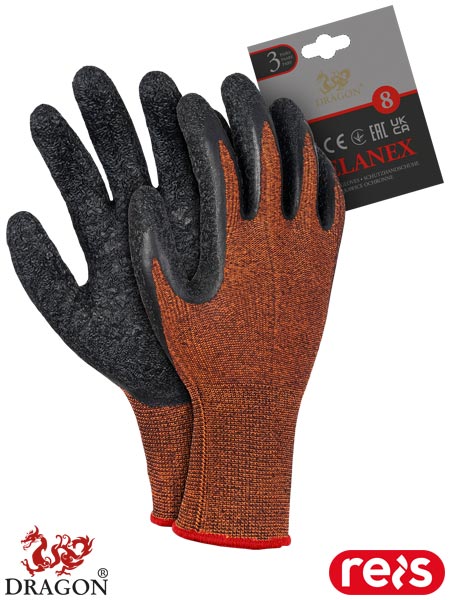 Rękawice ochronne.- dzianina: 60% poliester, 40% elastan (ścieg 13)- powlekane lateksem o chropowatej strukturze zapewniającej doskonałą chwytność, nie powodując usztywnienia rękawicy- zakończone ściągaczem- w pakiecie znajdują się 3 pary- każdy pakiet posiada zawieszkę, dzięki czemu świetnie się prezentują i są idealne na wszelkiego rodzaju prezentacje- stosowane w budownictwie oraz przemyśle transportowym