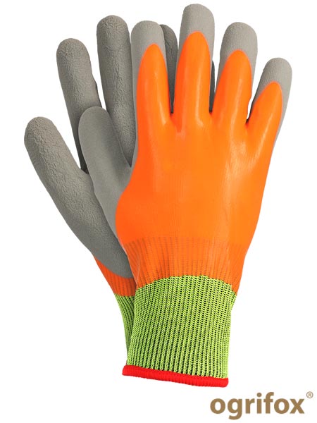 Rękawice ochronne ocieplane.- podwójna warstwa dzianiny: z zewnątrz 100% poliester (ścieg 13), od wewnątrz 100% pętelkowy poliester (ścieg 7)- część wierzchnia powlekana fluorescencyjnym pomarańczowym lateksem typu smooth- w części chwytnej powlekane lateksem typu FOAM- zakończone ściągaczem- wykorzystywane w budownictwie oraz przemyśle transportowym