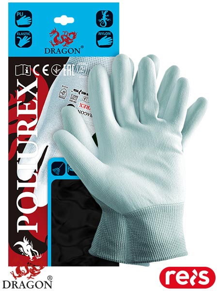 Rękawice ochronne.- dzianina: 100% nylon (ścieg 13)- powlekane poliuretanem- zakończone ściągaczem- charakteryzują się zwiększoną odpornością na rozdarcie- zapewniają manualność oraz doskonałe czucie trzymanego przedmiotu- wykazują bardzo dużą elastyczność, a tym samym odporność na rozciąganie oraz świetnie dopasowują się do dłoni- idealne do prac, gdzie wymagana jest precyzja- wykorzystywane do ogólnych prac mechanicznych- każda para pakowana w osobną torebkę, dzięki czemu świetnie się prezentują i są idealne na wszelkiego rodzaju prezentacje