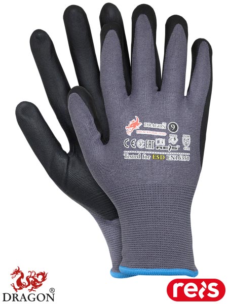 Rękawice antyelektrostatyczne ESD.- wykonane z mieszanki nylonu, elastanu oraz włókna węglowego (ścieg 15)- powlekane spienionym nitrylem typu FOAM w kolorze czarnym- zakończone ściągaczem- najwyższy współczynnik odporności na ścieranie (4)- zapewniają manualność oraz doskonałe czucie trzymanego przedmiotu- nitryl zwiększa odporność na smary i oleje, a technologia FOAM zwiększa elastyczność rękawicy- wykorzystywane do ogólnych prac mechanicznych- idealne do przemysłu elektronicznego- polecane do prac z ekranami dotykowymi- każda para pakowana w osobną torebkę