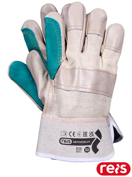 Rękawice ochronne wzmacniane skórą licową.- skóra bydlęca licowa- część chwytna, palec wskazujący oraz kciuk dodatkowo wzmacniane skórą bydlęcą w kolorze zielonym, dzięki czemu rękawica jest odporniejsza na przetarcie i zużycie- część wierzchnia wykonana z jasnego drelichu bawełnianego- kauczukowy usztywniany mankiet- od wewnątrz bawełniana podszewka podnosząca komfort użytkowania- połączenie wysokiej jakości skóry licowej z wzmocnieniami ze skóry bydlęcej tworzą rękawicę mocną i wytrzymałą- popularnie stosowane do ogólnych prac mechanicznych, w budownictwie, przemyśle ciężkim- idealne do przenoszenia przedmiotów, które kładą duży nacisk na część wewnętrzną rękawicy, jak na przykład metalowe pręty
