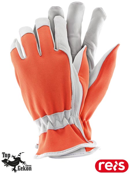 Rękawice ochronne wykonane z wysokiej jakości skóry koziej.- skóra kozia licowa w jasnych kolorach- wierzch wykonany z fluorescencyjnej tkaniny w kolorze pomarańczowym- całodłonicowe - część chwytna wykonana z jednego kawałka skóry, dzięki czemu wykazują większą wytrzymałość i odporność na przetarcia- wysokiej jakości miękka skóra kozia zapewnia doskonały komfort pracy- marszczenie w nadgarstku sprawia, iż rękawica przylega do dłoni i lepiej chroni przed dostaniem się do jej wnętrza wiatru czy piasku- doskonałe dla kierowców oraz drogowców