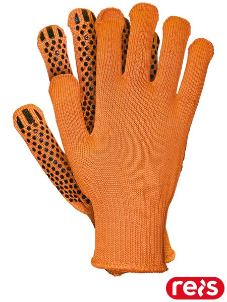 Rękawice ochronne.- podwójna warstwa dzianiny: z zewnątrz 100% poliester (ścieg 10), od wewnątrz 80% poliester, 20% akryl (ścieg 10)- duże płaskie nakropienie z PCV na części dłonicowej zapewnia dobrą chwytność podczas przenoszenia towarów, a także zwiększa trwałość rękawicy- zakończone ściągaczem- idealne w przemyśle transportowym- sprawdzają się w budownictwie
