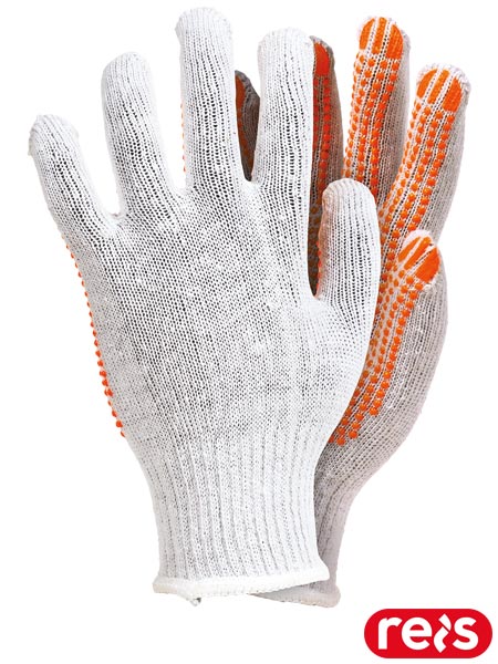 Rękawice ochronne.- dzianina: 50% poliester, 50% bawełna (ścieg 10)- jednostronne fluorescencyjne nakropienie z PCV na części chwytnej, które zapewnia dobrą chwytność podczas przenoszenia towarów, a także zwiększa trwałość rękawicy- zakończone ściągaczem