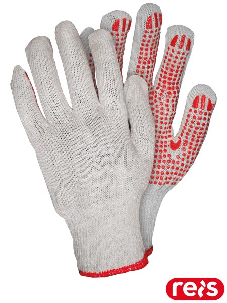 Rękawice ochronne.- dzianina: 65% poliester, 35% bawełna (ścieg 10)- jednostronne nakropienie z PCV na części chwytnej zapewniajce dobrą chwytność podczas przenoszenia towarów, a także zwiększa trwałość rękawicy- zakończone ściągaczem- połączenie poliestru z bawełną tworzy rękawice rozciągliwą, a zarazem przewiewną i bardziej wytrzymałą- idealne w przemyśle transportowym