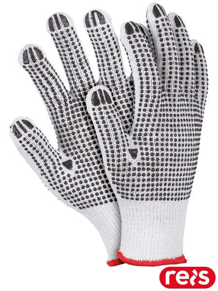 Rękawice ochronne.- dzianina: 50% poliester, 50% bawełna (ścieg 10)- dwustronne nakropienie z PCV na części dłonicowej zapewnia dobrą chwytność podczas przenoszenia towarów, a także zwiększa trwałość rękawicy- zakończone ściągaczem- połączenie poliestru z bawełną tworzy rękawice rozciągliwą, a zarazem przewiewną i bardziej wytrzymałą- idealne w przemyśle transportowym- sprawdzają się w budownictwie