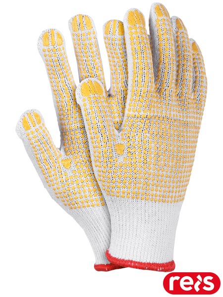 Rękawice ochronne.- dzianina: 50% poliester, 50% bawełna (ścieg 10)- dwustronne nakropienie z PCV na części dłonicowej zapewnia dobrą chwytność podczas przenoszenia towarów, a także zwiększa trwałość rękawicy- zakończone ściągaczem- połączenie poliestru z bawełną tworzy rękawice rozciągliwą, a zarazem przewiewną i bardziej wytrzymałą- idealne w przemyśle transportowym- sprawdzają się w budownictwie