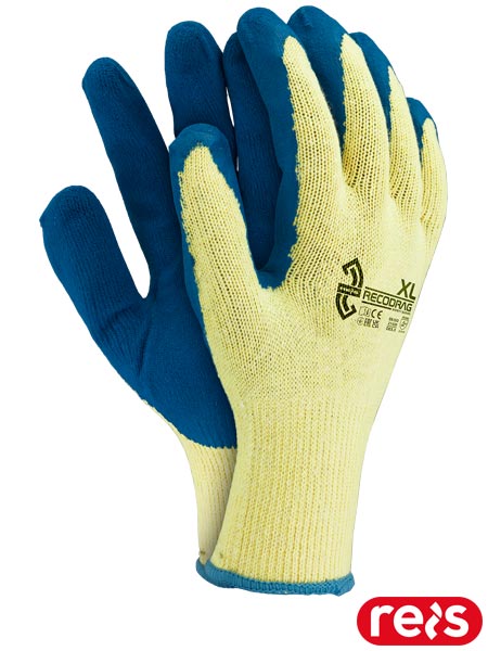 Rękawice ochronne.- dzianina: połączenie bawełny i poliestru (ścieg 10)- powlekane lateksem- zakończone ściągaczem- odporne na rozdarcie i powstawanie pęknięć- trudnościeralne i odporne na zużycie- stosowane w budownictwie oraz przemyśle transportowym