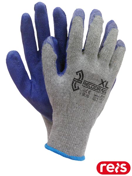 Rękawice ochronne.- dzianina: połączenie bawełny i poliestru (ścieg 10)- powlekane lateksem- zakończone ściągaczem- odporne na rozdarcie i powstawanie pęknięć- trudnościeralne i odporne na zużycie- stosowane w budownictwie oraz przemyśle transportowym