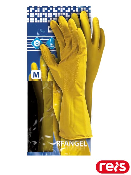 Rękawice ochronne.- wykonane z lateksu- flokowane - wewnętrzna powierzchnia rękawic pokryta jest flokiem (pyłem bawełnianym), co ułatwia wkładanie i zdejmowanie oraz zapobiega poceniu się rąk w czasie użytkowania- na części chwytnej chropowata struktura, dzięki czemu rękawiczki zyskują lepszą przyczepność- długość 30 cm- średnia grubość 0,35 mm- odporne na rozciąganie- wysoka odporność na detergenty i środki piorące- mogą być stosowane w kontakcie z żywnością- każda para pakowana w osobną torebkę, dzięki czemu świetnie się prezentują i są idealne na wszelkiego rodzaju prezentacje- potocznie znane jako floki lub rękawice gospodarcze