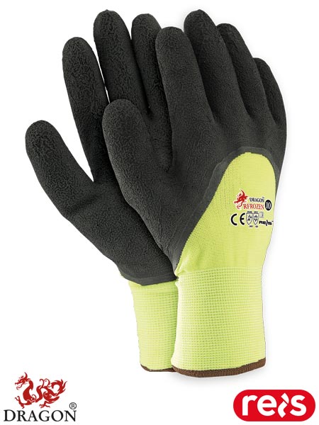 Rękawice ochronne ocieplane.- podwójna warstwa dzianiny: z zewnątrz mieszanka nylonowo-poliestrowa (ścieg 15), od wewnątrz 100% przędza akrylowa (ścieg 7)- powlekane spienionym lateksem- zakończone ściągaczem- wysoka odporność na przecięcie i rozdarcie- idealne do prac w niskiej temperaturze zewnętrznej, stosowane na magazynach, jak również w chłodniach- wykorzystywane w budownictwie oraz przemyśle transportowym- ze względu na fluorescencyjną dzianinę idealne dla drogowców