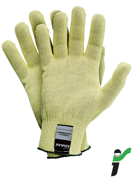 Rękawice ochronne dziane.- wykonane z przędzy para-aramidowej Kevlar® (ścieg 10)- zakończone ściągaczem- bezszwowe- dobra ochrona cieplna w przypadku niewielkich zagrożeń termicznych- stosowane również jako wkłady pod rękawice gumowe, lateksowe i inne- zgodne z normami EN388 (poziomy odporności: 1 3 4 1 X) oraz EN420