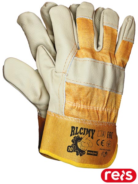 Rękawice ochronne wzmacniane skórą bydlęcą.- skóra bydlęca licowa w jasnych kolorach- drelich usztywniony, kauczukowy mankiet w kolorze żółtym- całodłonicowe - część chwytna rękawicy wykonana z jednego kawałka skóry, dzięki czemu wykazują większą wytrzymałość i odporność na przetarcia- od wewnątrz wypodszewkowane, co podnosi komfort użytkowania- popularnie stosowane do ogólnych prac mechanicznych- wykorzystywane w budownictwie, przemyśle ciężkim
